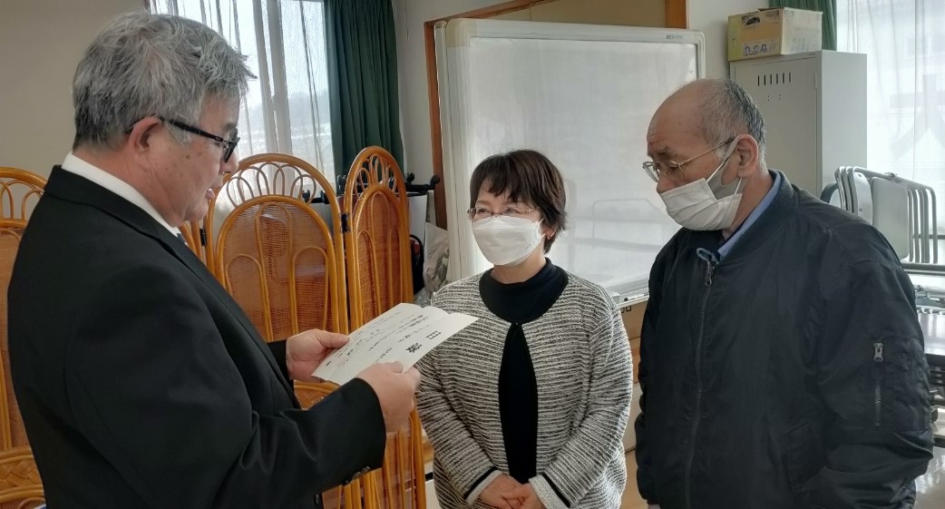 2月12日には、池田会長様、幹事の保久様、事務局の斉藤様にご来所いただき、贈呈式を行いました。